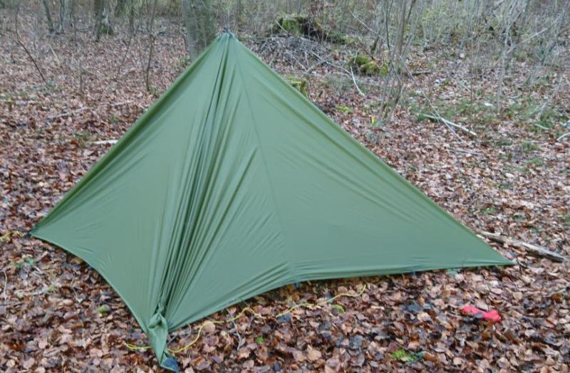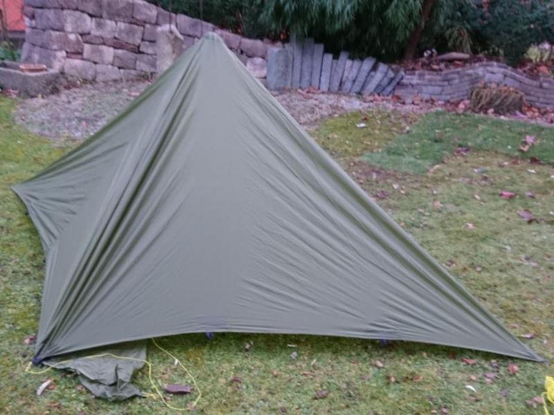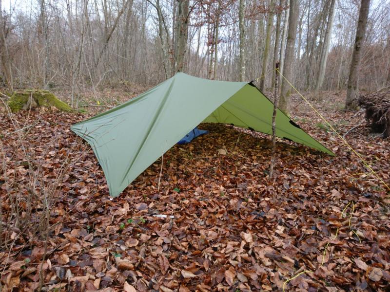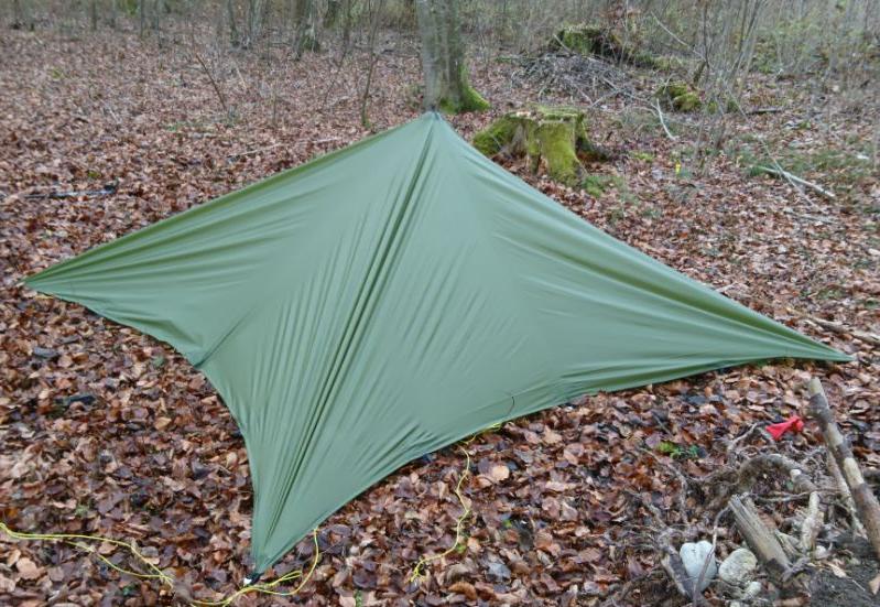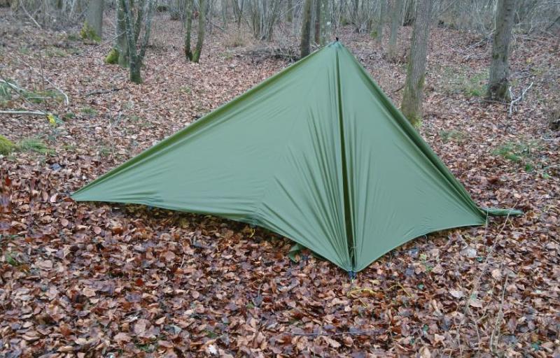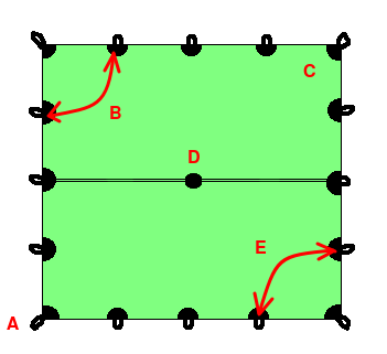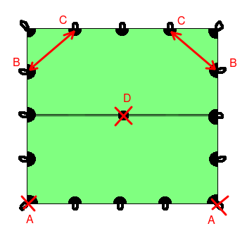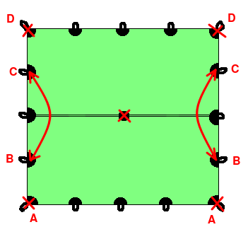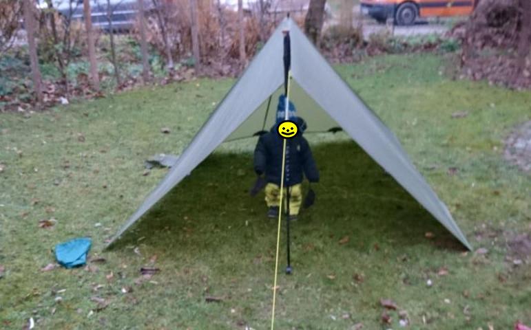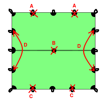 Zum Aufbau spannt man alle vier Ecken, am Besten über ca 1 m lange Leinen, nicht zu straff ab. Anschließend kommt der Stock in die Mitte, Zusätzlich kann man natürlich noch beliebig viele seitliche Abspannungen verwenden um die Stabilität des Unterschlupfes zu erhöhen. Thoretisch könnten also maximal 16 Heringe verwendet werden. An der windabgewandten Seite kann ein zusätzlicher Stab den Eingang hochhalten. |