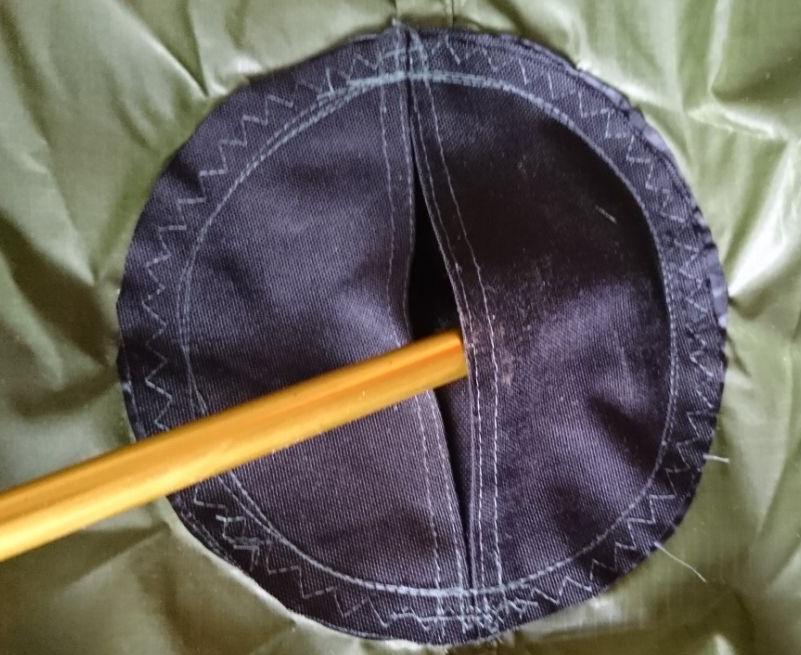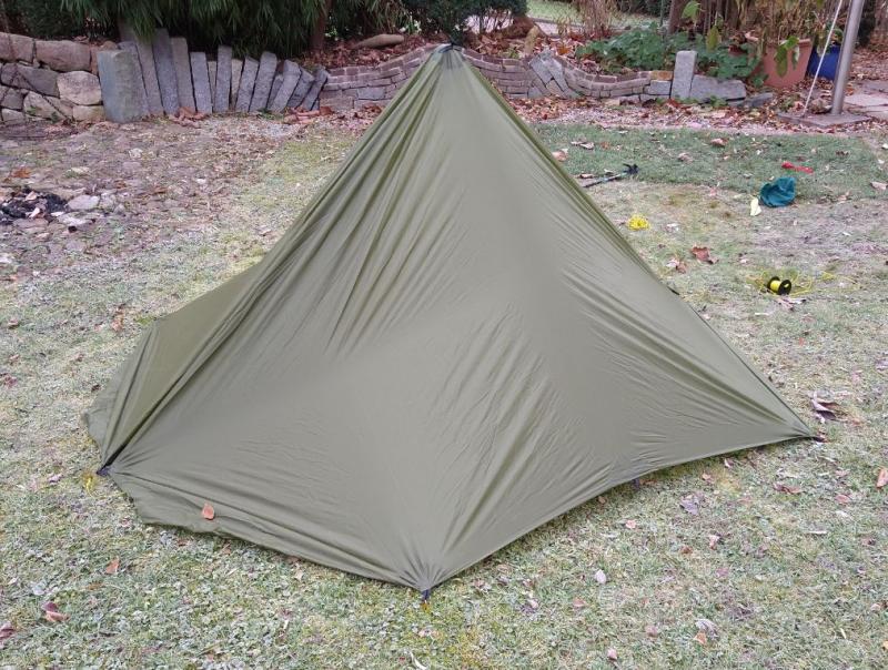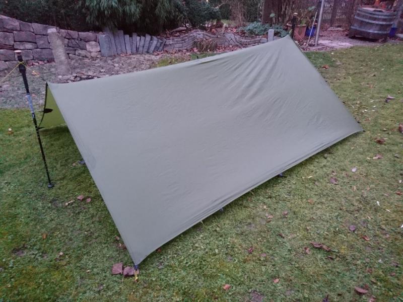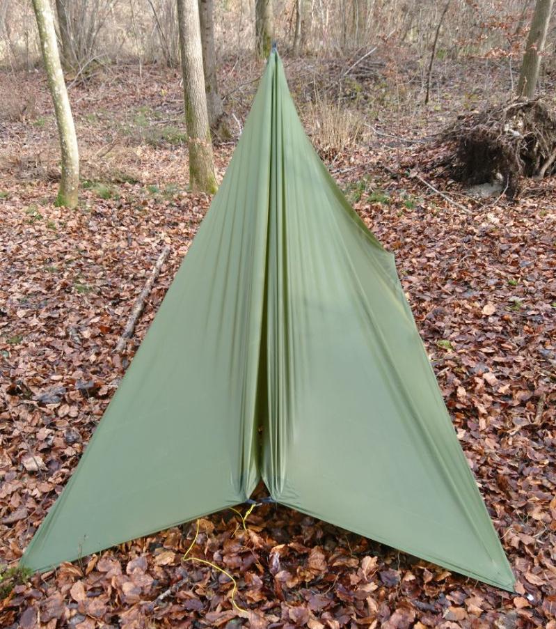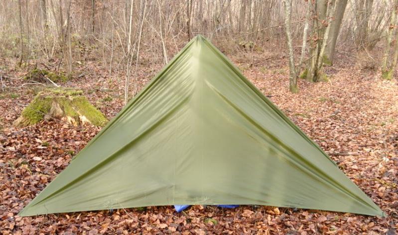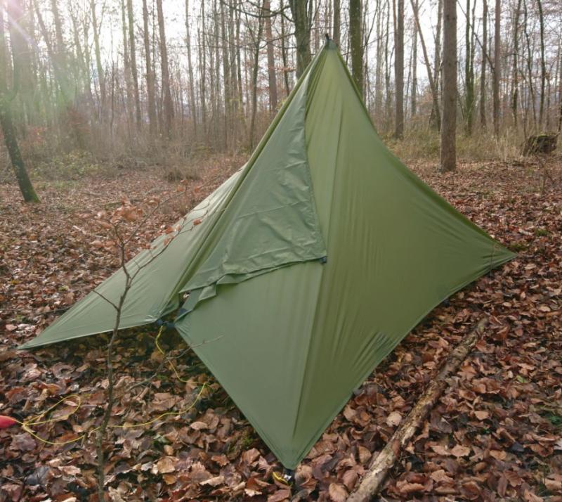 Zum Aufbau spannt man alle vier Ecken, am Besten über ca 1 m lange Leinen, nicht zu straff ab. Anschließend kommt der Stock in die Mitte, Zusätzlich kann man natürlich noch beliebig viele seitliche Abspannungen verwenden um die Stabilität des Unterschlupfes zu erhöhen. Thoretisch könnten also maximal 16 Heringe verwendet werden. An der windabgewandten Seite kann ein zusätzlicher Stab den Eingang hochhalten. |